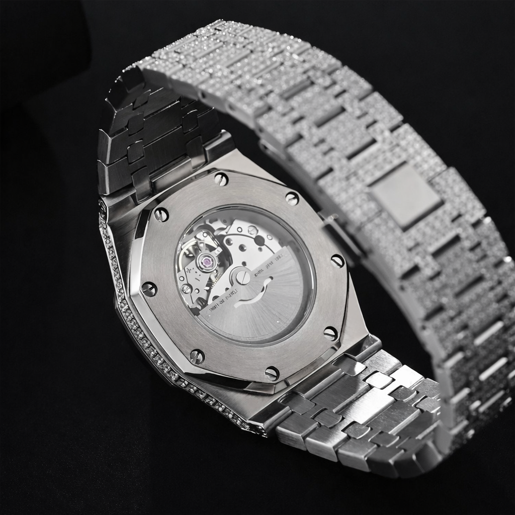 Este impresionante reloj iced out está completamente engastado con moissanitas de alta calidad, ofreciendo un brillo intenso y elegante que rivaliza con los diamantes. Cada piedra ha sido colocada con precisión para lograr un acabado uniforme y lujoso tanto en la caja como en el bisel y el brazalete.